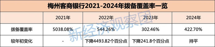 因成立时间较短,目前梅州客商银行的资产质量暂时稳定。2021-2024年,该行不良贷款率分别为0.04%、0.46%、0.97%和0.97%,虽然有一定上升,但仍处于。同时,拨备覆盖率也在同期达到5038.08%、544.26%、302.46%、422.70%。