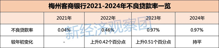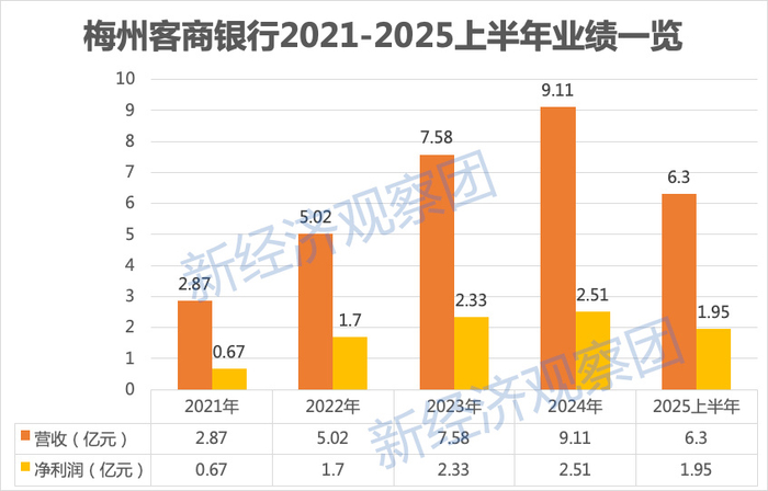 作为广东省第二家民营银行,梅州客商银行自成立以来便以创新的服务模式和快速增长的业绩吸引了市场的关注。数据显示,从2021年至2024年间,该行营业收入由2.87亿元跃升至9.11亿元,增长217%;同期净利润从0.67亿元上升到了2.51亿元,增长275%。但在这些亮眼数字背后,梅州客商银行的隐忧也在浮现。