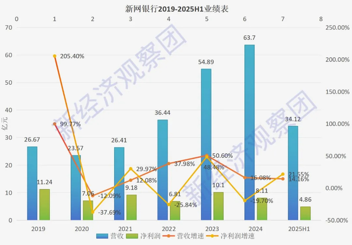 业绩方面,新网银行成立以来波动较大。新经济观察团通过统计发现,2019年,其营业收入翻番至26.67亿元,净利润达到11.24亿元,同比增长高达205.4%;但2020年,受到美利金融和网贷业务影响,新网银行业绩增速急转直下,当年净利润为7.06亿元,较2019年下降37.69%;营收为23.57亿元,同比下降12.09%。随后几年,新网银行业绩增速再难回到2019年的巅峰时刻,其净利润的波动始终如过山车。
