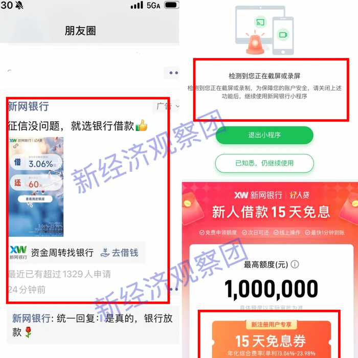 今年1月28日,新经济观察团小编在微信朋友圈频繁刷到新网银行“好人贷”的推广,页面用大字显示利率3.06%,但是右下角用白色小字又显示放款利率在3.06%-23.98%之间,即最高利率直逼24%的监管红线。此外,在小编尝试录屏后,新网银行小程序页面频繁弹出“安全提示”,要求关闭该功能后重启才能使用。在小编测试过的大量贷款平台中,新网银行这种做法还是首次遇见。
