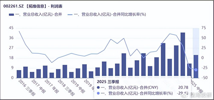 从收入规模来看,2025年三季度,拓维总收入约20.78亿元,同比下降近30%。总体来看,自2025年以来,公司收入呈下降趋势,具体原因就是公司业务转型调整。