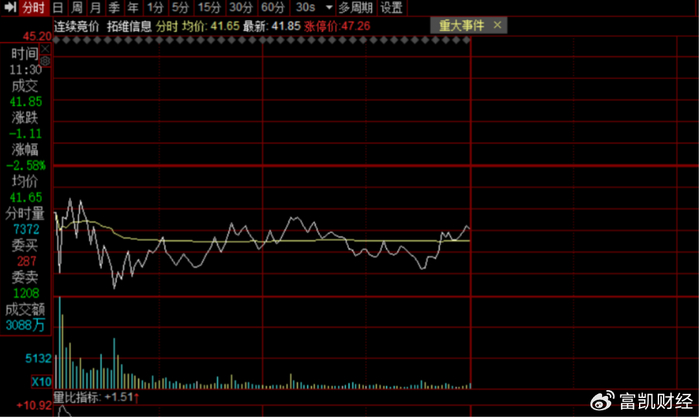 3月10日早盘,拓维信息股价下挫超过5%,午盘收盘时跟随大盘有所反弹,暂时以下跌2.58%收盘。