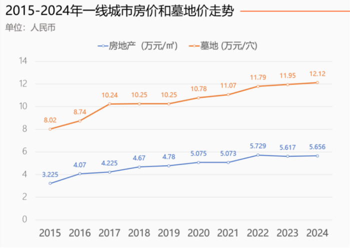 2024年,一线城市墓地均价为12.12万/穴,而一线城市房产均价为5.656万/㎡。