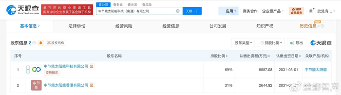 天眼查工商信息显示,近日,中节能太阳能科技(南通)有限公司成立,法定代表人为王振国,注册资本8532万人民币,经营范围包括太阳能发电技术服务、光伏设备及元器件销售、光伏发电设备租赁等。股东信息显示,该公司由中节能太阳能科技有限公司、中节能太阳能香港有限公司共同持股。