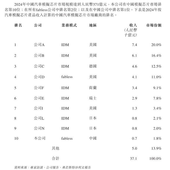 根据纳芯微在文件的说法,2024年中国汽车模拟芯片市场规模达到人民币371亿元,纳芯微在中国模拟芯片市场排名第10位,在所有fabless公司中排名第2位,中国公司中排名第1位。