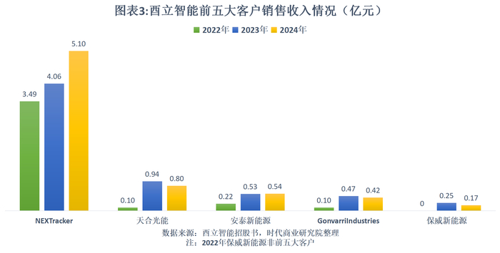 具体来看,2024年,酉立智能对上述五大客户的销售额同比增速分别为25.79%、-15.35%、1.42%、-10.22%、-30.07%。其中,酉立智能对天合光能、GI和保威新能源的销售额分别同比减少0.14亿元、0.05亿元、0.07亿元。