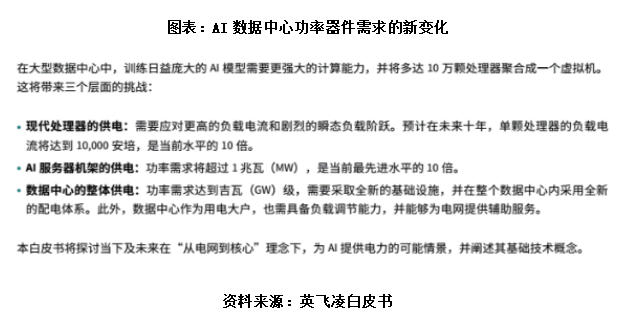 这一变化的底层逻辑,在英飞凌于2025年12月底发布的《AI供电的未来——重新定义AI数据中心供电》白皮书中得到明确印证。白皮书指出,AI模型训练对算力的极致需求,正引发数据中心供电体系三重颠覆性变革:单颗处理器负载电流十年内将攀升至10000安培,达到当前水平的10倍;AI服务器机架功率将突破1兆瓦,为当前先进水平的10倍;数据中心整体功率需求向吉瓦级规模迈进,传统供电架构已无法适配这一非线性增长的电力需求。作为供电体系核心器件的功率半导体,需求迎来量级式跃升。