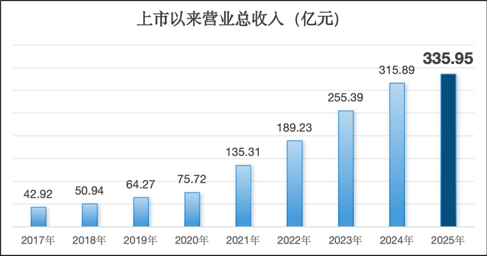 年报显示,2025年佛燃能源实现营业总收入335.95亿元,同比增长6.35%。自上市以来,公司业绩保持稳定增长,公司营业收入从2017年的42.92 亿元增长至 2025年的335.95亿元,年复合增速达29.33%。