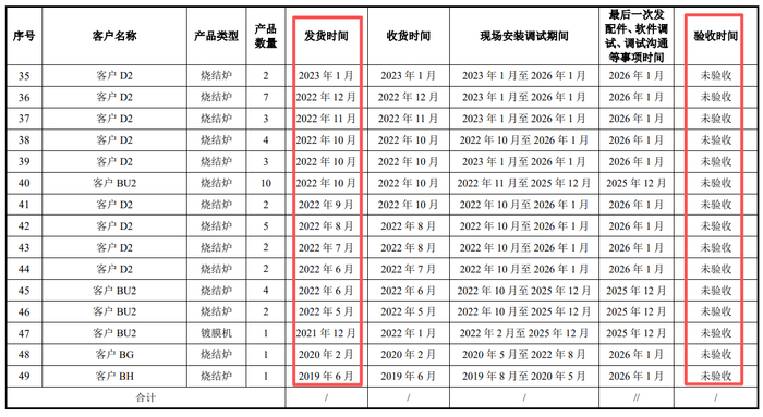 此外,广泰真空还在回复中援引下游应用领域同为稀土永磁行业的百达智能作为参照,称其验收周期在11~18个月。但即便如此,广泰真空有大量2022年、2023年发货的设备至今仍未验收,最早甚至有2019年发货的设备至今未验收,其回款周期远超百达智能周期上限。