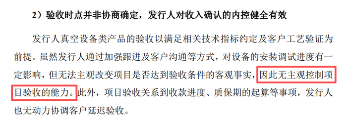其在回复中称,对验收时点“无主观控制项目验收的能力”,即验收时点完全由客户决定。这一表述揭示了两个深层问题:其一,即便采用时点法确认收入,卖方也应有相应的合同约束和回款管理机制,而广泰真空的说法无异于承认面对下游客户毫无话语权,回款管理存在重大漏洞;其二,如果验收时点完全由客户掌握,则将为客户与广泰真空的跨期收入调节预留巨大操作空间。