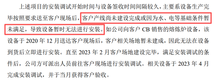 其将超长回款期的归因于三点:现场安装调试出差结束后至验收时间较长、发货后等待安装时间较长、现场安装调试时间较长。其中,部分案例的原因是“客户场地水电未接通,导致设备无法安装”。