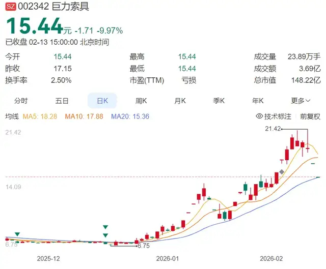 2025年2月末至2026年2月,巨力索具的股价从3.14元飙至20.79元,一年翻了6.6倍;2026年1月涨近60%、2月涨近40%,短短两个月股价狂飙3倍,市值一度突破200亿。