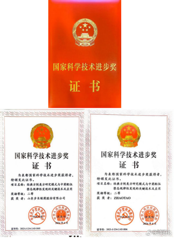 值得一提的是,2024年6月,由山东步长制药股份有限公司及其董事长赵涛参与完成的“经典方剂类研究模式与中药配伍禁忌规律性发现的关键技术及应用”项目中,山东步长制药股份有限公司与董事长赵涛分别荣获2023年度“国家科学技术进步奖二等奖”。
