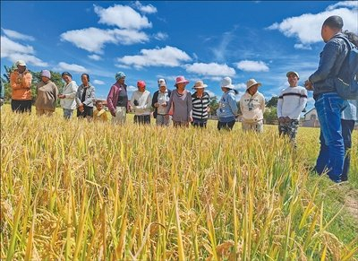 在位于马达加斯加首都塔那那利佛附近的中国国家杂交水稻工程技术研究中心非洲分中心试验田里,当地农业技术人员和水稻种植户查看作物长势。 张立军摄