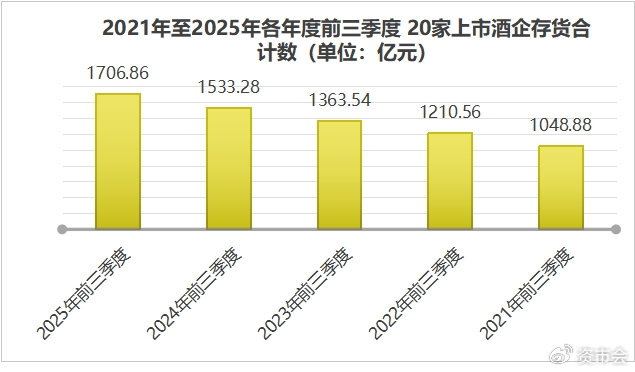 2025年三季度末,20家上市酒企存货合计1766.86亿元,同比增长11%。与2021年前三季度相比,四年间增长63%。