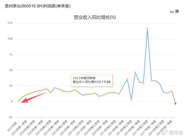 今年第一季度和第二季度,贵州茅台的营收同比增速分别有10.54%、7.28%,第三季度增速骤降至0.56%,几乎陷入停滞。