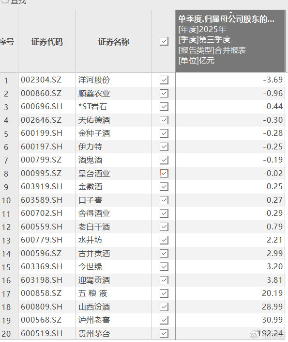 (2025年第三季度20家酒企归母净利,图源:choice)