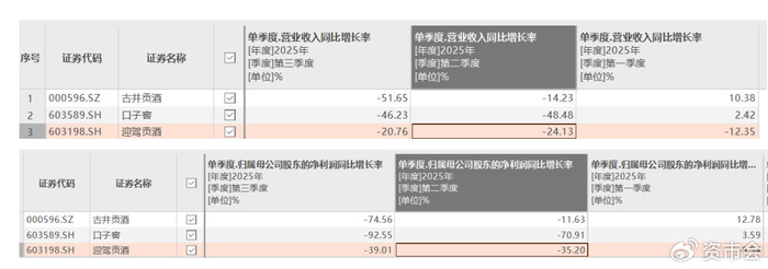 其中,水井坊(600779.SH)、古井贡酒(000596.SZ)第三季度营收同比分别暴跌58.91%、51.65%,老白干酒(600559.SH)、口子窖(603589.SH)等出现大幅下滑。
