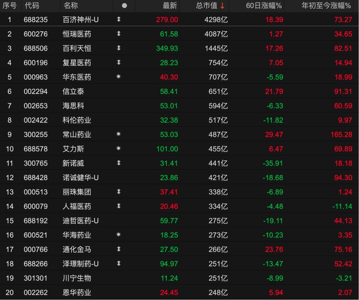 相比之下,部分传统药企尽管营收规模较大,但市值与股价表现平平,如华东医药、人福医药等,估值提升空间仍待业绩与转型预期进一步兑现。