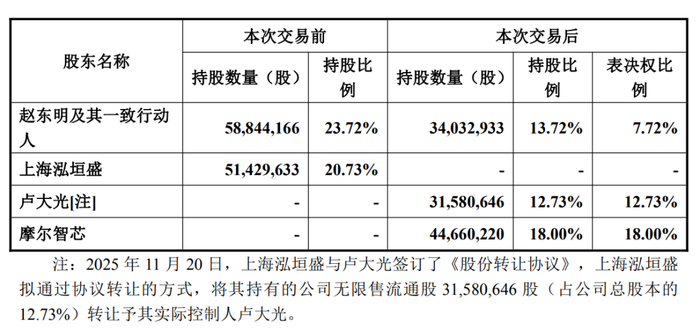 如今时隔仅两年多,赵东明及其一致行动人便选择出让控股权,引入摩尔智芯作为新的控股股东。