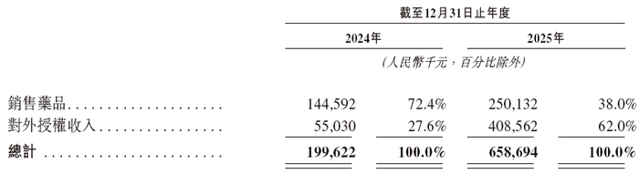 BD合作的密集落地与产品商业化的稳步推进,直接反映在了迈威生物2025年的财务数据上。2025年年报显示,迈威生物全年实现营业总收入6.63亿元,同比大幅增长231.62%;归母净利润为-9.69亿元,亏损较上年有所收窄,经营状况呈现向好态势。从收入构成来看,主要来自药品销售、对外授权收入。