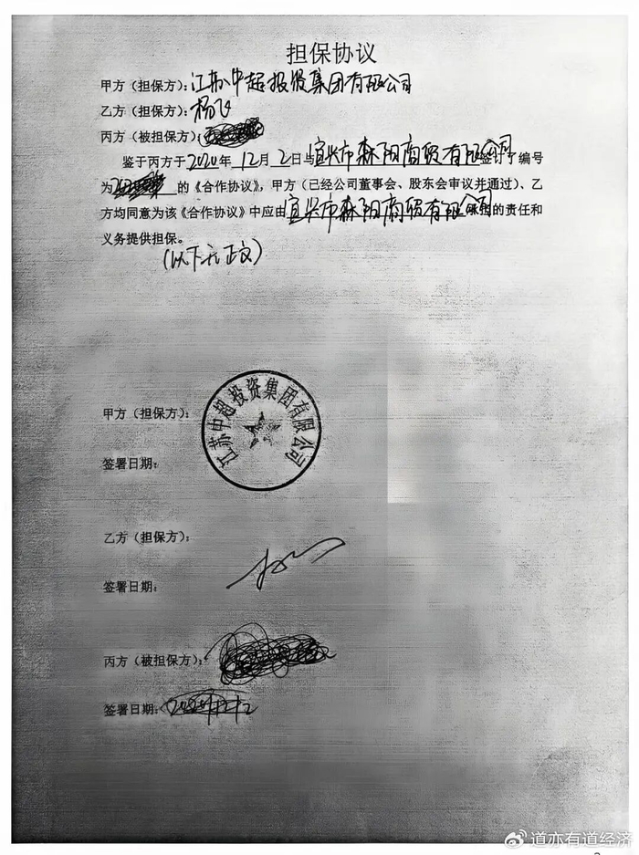 更令人费解的是,2020年12月2日,江苏中超投资集团以担保人的角色出现了。A股上市公司中超控股的实际控制人杨飞同时出现在担保协议里。中超投资集团的法人也是杨飞,两个主体都为合作协议里宜兴森阳应当承担的责任和义务提供了担保。
