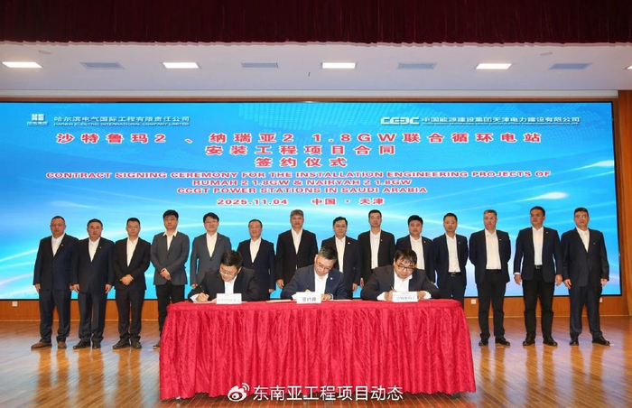 近日,哈电国际与天津电建在中国能建天津电建总部大楼举行沙特鲁玛Ⅱ和沙特纳瑞亚Ⅱ联合循环电站安装工程项目合同签约仪式。这是天津电建首次进入沙特市场,将依托在联合循环电站领域积累的丰富经验和核心技术,与哈电国际携手实现从“项目合作”到“价值共享”,为中东地区乃至全球的绿色低碳发展注入强劲、稳定的动力。