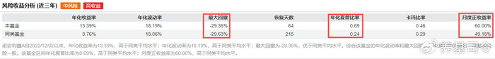 Wind数据显示,截至2025年12月1日,诺安利鑫近三年年化收益13.39%,区间最大回撤-29.36%,年化夏普比率0.69,月度正收益概率60%,这几组数据均要优于同期的同类型基金。
