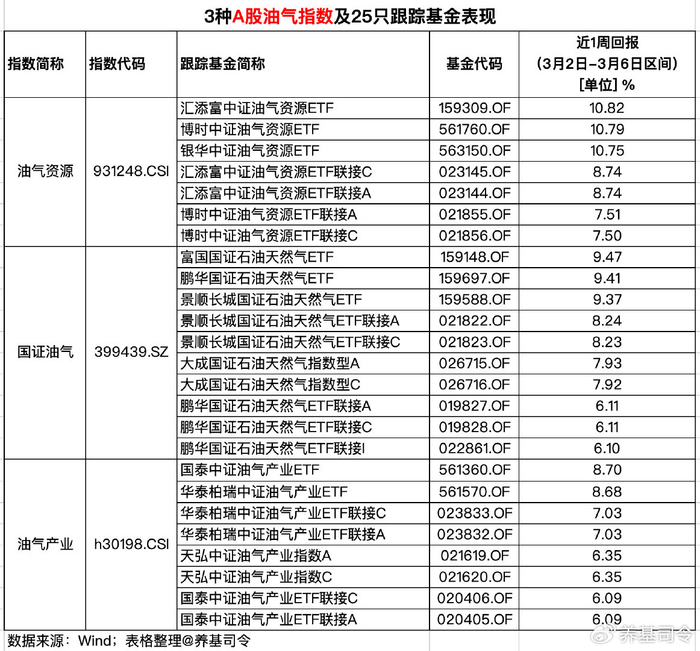 从上周(3月2日-3月6日区间)表现来看,油气资源(931248.CSI)上涨10.90%,国证油气(399439.SZ)上涨9.50%,油气产业(h30198.CSI)上涨8.74%。