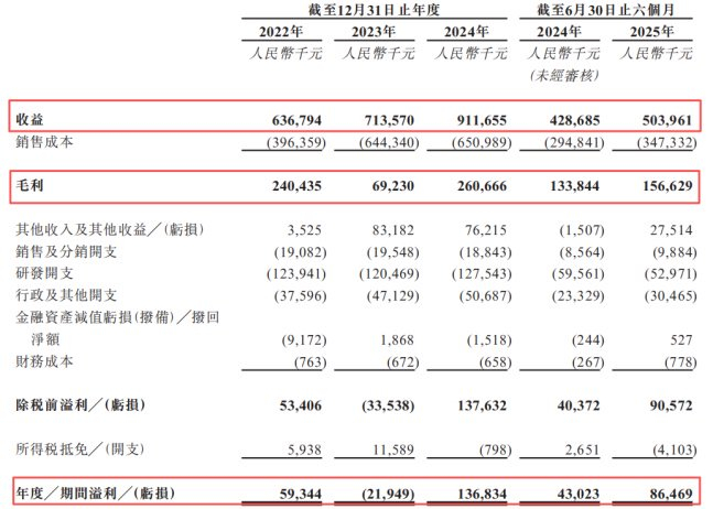 2022年、2023年、2024年和2025年1-6月(报告期),公司的收入分别为6.37亿元、7.14亿元、9.12亿元、5.04亿元,净利润分别为5934万元、-2195万元、1.37亿元、8647万元。