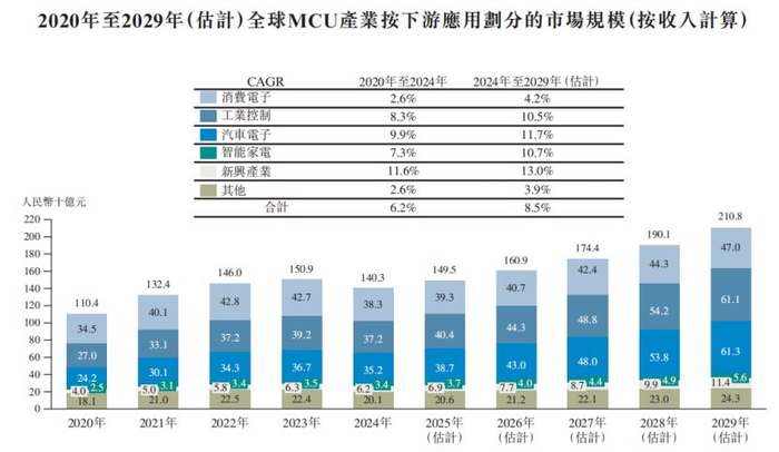 根据弗若斯特沙利文资料,2024年全球MCU市场规模达1403亿元,预计2029年增至2108亿元,CAGR为8.5%。