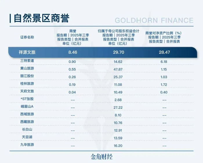 在申万自然景区板块13家公司里,除了祥源文旅,没有一家商誉超过1亿元。如果换成相对口径,用净资产作为分母,祥源文旅商誉占净资产的比例更接近30%,同样远远把同行甩在身后。