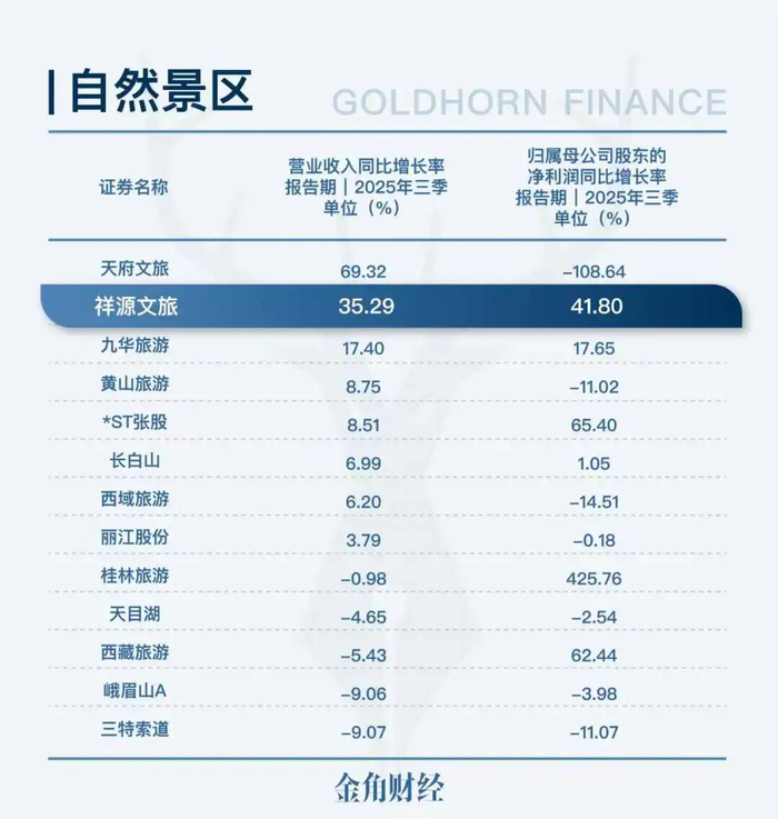 前三季度,祥源文旅实现营收8.44亿元,同比增幅35.29%,归母净利润1.56亿元,同比增长41.8%。横向对比申万自然景区板块的13家上市公司,祥源文旅营收增速排在第二,归母净利润增速也能排到第四。