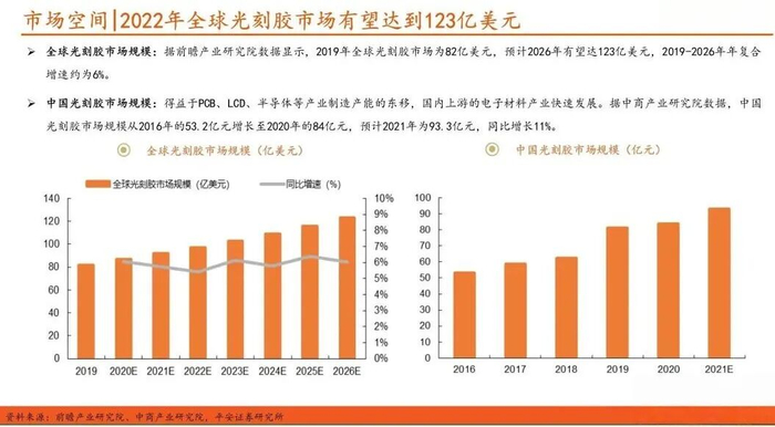 据前瞻产业研究院数据,2019年全球光刻胶市场规模为82亿美元,预计2026年将达123亿美元,2019–2026年复合年增速约6%。