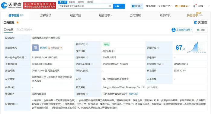 天眼查App显示,近日,江阴海澜之水饮料有限公司成立,法定代表人为薛海军,注册资本500万人民币,经营范围包括食品销售、食品用塑料包装容器工具制品销售、塑料制品销售、保健食品销售等。股东信息显示,该公司由海澜之家品牌管理有限公司全资持股。