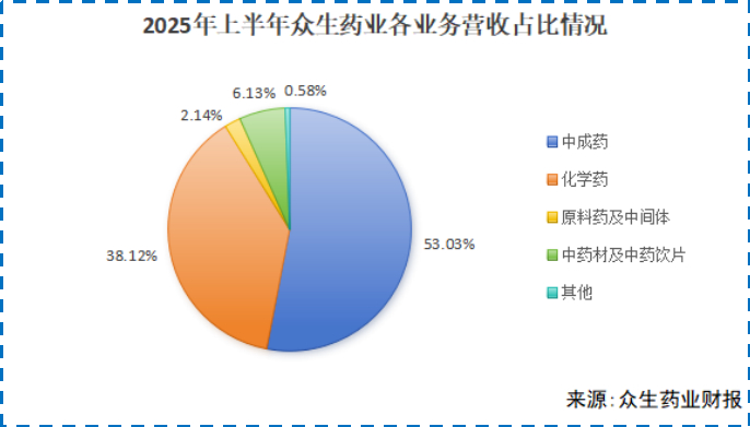 根据2025年上半年财报,这个架构的成果清晰可见:中成药贡献了53.03%的营收,化学药(包括仿制药和创新药)贡献了38.12%,两大板块合计支撑起公司超过九成的江山。