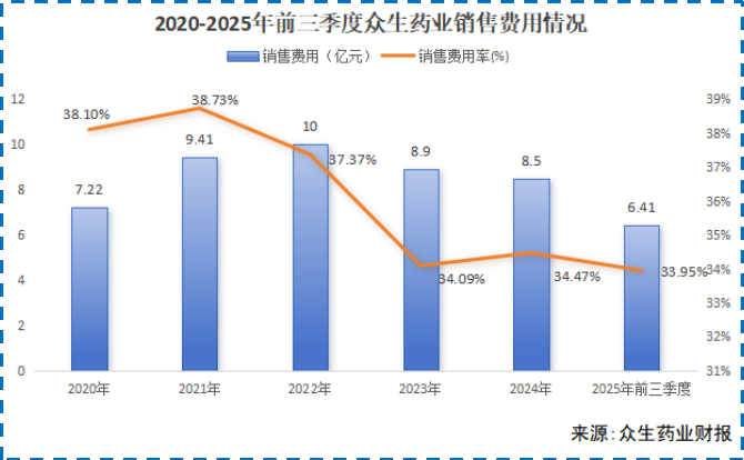 公司的期间费用率(销售、管理、研发、财务费用总和占营收比)从2020年的51.43%,显著优化至2025年前三季度的42.11%。虽然绝对值仍达4.38亿,但费用率从38.1%降至33.95%。公司覆盖超1.3万家医院和22万家药店的成熟网络,使得销售效率在提升。