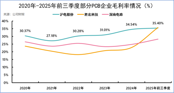 2020年至2025年前三季度,沪电股份的毛利率从30.37%一路提升至35.4%。这个数字长期显著高于胜宏科技、深南电路等同行(它们通常在25%左右)。直到2025年,胜宏科技因大力押注AI等高附加值产品,毛利率才奋力追平。