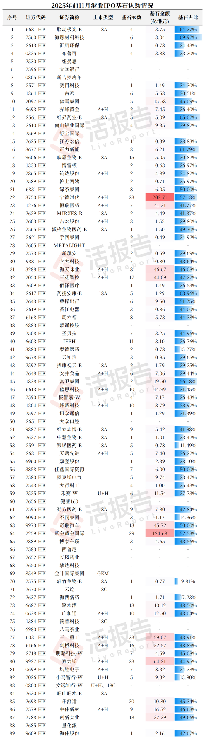 前11月港股共有71只新股引入了基石投资者,占比达80%,较去年有明显提升。参与认购的基石投资者累计达478家(未去重),基石投资总额达992亿港元,占总体香港IPO募资额的38%。