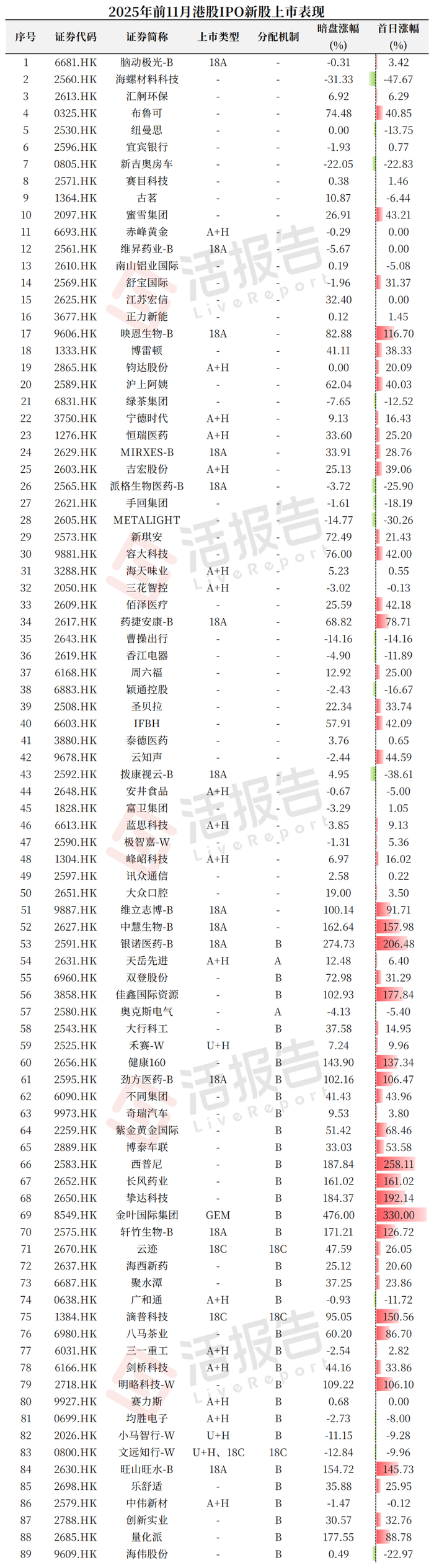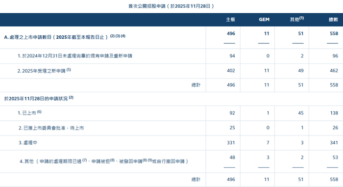 据港交所数据,截至11月底,今年港交所已接获发主板及GEM上市申请超过500宗,其中已获批待上市的有25宗,仍在排队处理的还有338宗。