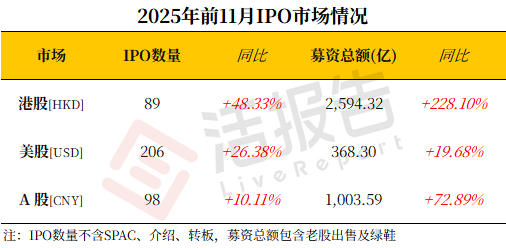 2025年前11个月,美股市场有206只新股IPO上市,同比增长26.4%;合计募资368亿美元,同比增长约19.7%。美股IPO发行保持缓慢复苏,但私募股权支持的IPO激增,有望使明年IPO总额回升至疫情之前十年的平均水平以上。