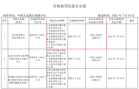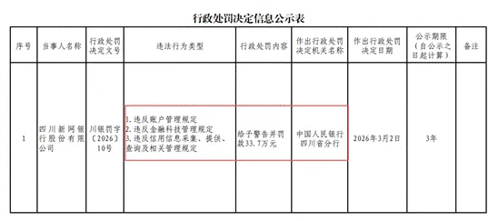 战略愿景很美好,但现实总是残酷的。3月6日,中国人民银行四川省分行对其开出一张罚单,新网银行违反“账户管理”、“金融科技管理”、“信用信息采集、提供、查询及相关管理”3项规定,被给予警告并罚款33.7万元。