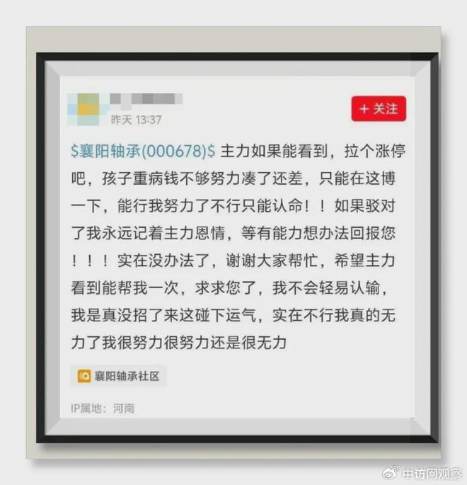 一则饱含绝望与期盼的网络求助,意外在A股市场掀起波澜。11月28日,襄阳轴承在低开后突然发力,上午10时20分起仅用五分钟便直线封死涨停,报收14.76元/股,2.27亿元的单日成交额中,近四分之一集中在这波闪电拉升中。而这波异动的导火索,是前一日股民在同花顺社区发布的求助帖——孩子重病急需资金的他,向'主力'哀求'拉个涨停',希望借此搏取救命钱。