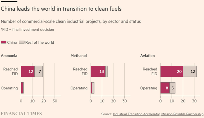 目前,中国在绿色燃料领域已经做出的最终投资决策(FID)与建成产能,都居于全球第一,且遥遥领先。能源体系正在从资源型产业,转向制造型产业。