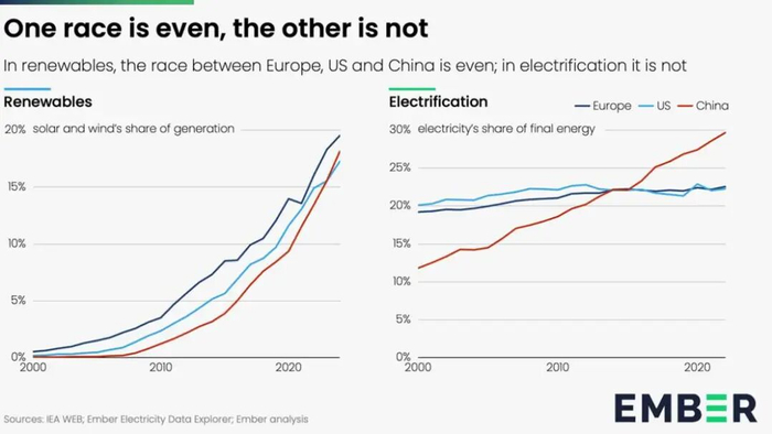 绿色燃料对石油的替代,并不是一种简单的技术路线替代,而是一场能源体系与工业体系的重构。而决定这一重构进程的关键变量,是电气化水平。一个经济体越依赖电力,其能源体系就越容易摆脱化石燃料。当电气化发展到更高阶段,电力还可以制造新的绿色燃料。中国的电气化程度,已经超过了美国,而且,仍在以更快的速度发展。