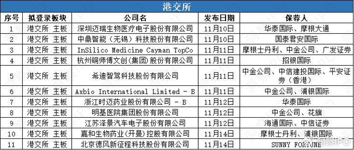 11月10日-11月17日,港交所有11家公司递交主板上市申请。