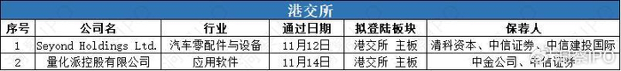 11月11日-11月17日,港交所主板有2家公司通过聆讯。
