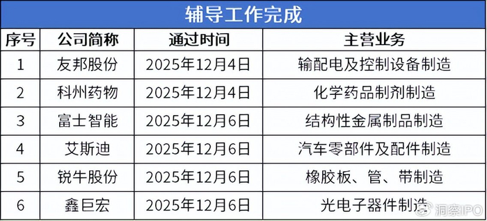 12月1日-12月7日,北交所有6家公司辅导工作完成。