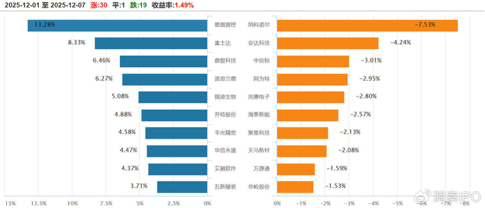 上周(12月1日-12月7日),北证50指数周跌1.49%至1408.34点。北证50成分股中,30只上涨,1只平盘,19只下跌。