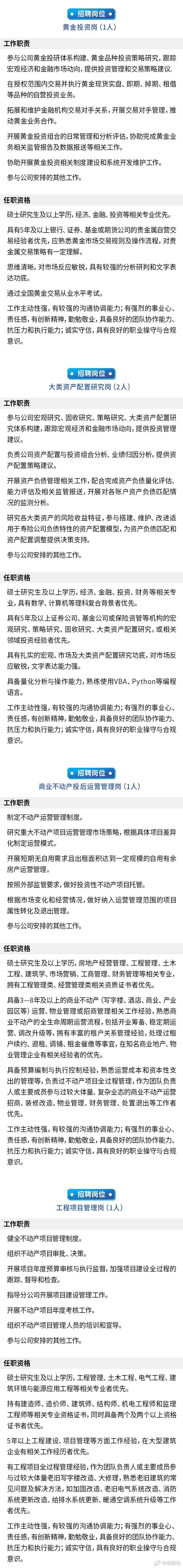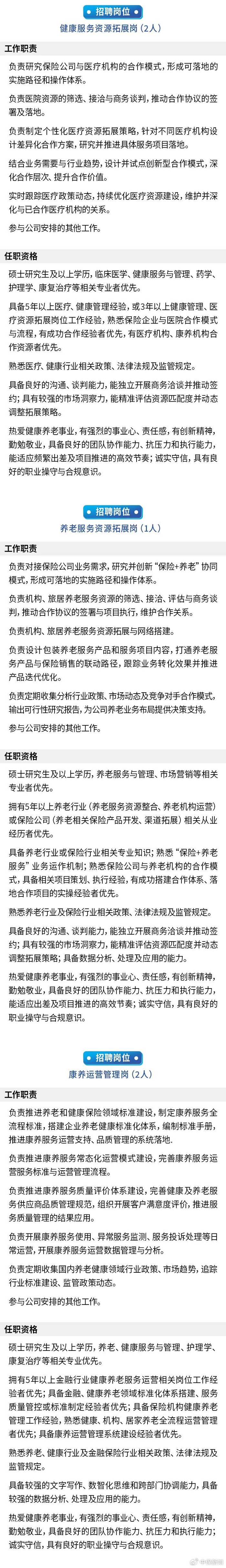 保险机构业务的聚焦方向也可从其人才招聘需求方面窥探一二。中保新知注意到,3月中旬,中国人寿保险股份有限公司在其官网发布了7个岗位需求,涉及健康服务资源拓展、养老服务资源拓展、康养运营管理、黄金投资、大类资产配置研究、商业不动产投后运营管理及工程项目管理岗。从上述职位不难看出,与健康、养老及投资等方面息息相关。